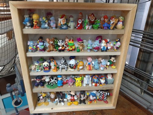 ארונית עץ עם חזית מזכוכית לתליה, כולל מיצג בובות של דמויות מעולם הילדים מכל הזמנים. מידות 30/40 ס”מ