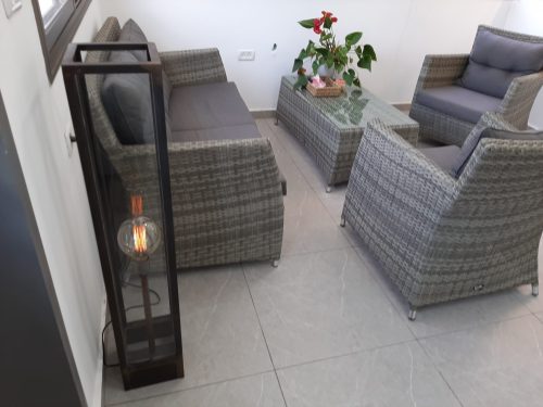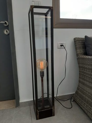 עשוי גוף מתכת במידות 18*18*120 ס”מ מצופה זכוכית ובמרכזו מוט נחושת. כולל חוט בד, מנורת פחם ועמעם מעוצב