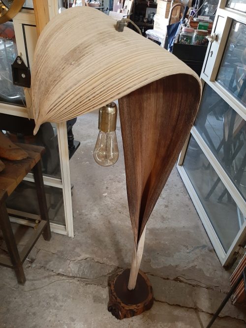 מנורת עמוד עשויה תרמיל דקל קוקוס עם בסיס גזר עץ סיסאם הודי בשילוב מנורת פחם לתאורת אווירה. גובה 120 ס”מ