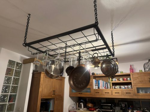 מתלה סירים במראה תעשייתי בשילוב אלמנט לתליית כוסות יין. עשוי פרופיל 20/20 מ”מ משולב עם ברזל מלא 10/10 מ”מ וברזל עגול בקוטר 6 מ”מ. תלייה באמצעות שרשראות ברזל. מידות: 90/90 ס”מ. ניתן לקבל בכל מידה רצויה