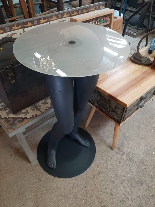 בסיס מתכת בשילוב בובת מניקין וזכוכית חלבית צבועים באפור גרפית. מידות: קוטר 47 ס”מ, גובה 84 ס”מ